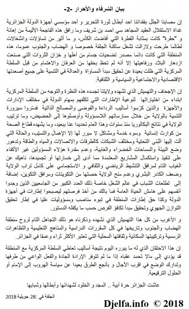 وحذروا من أن «هذا الاحتقان الذي له ما يبرره، نتيجة تعاطي السلطة المركزية مع المنطقة، قد يؤدي إلى ما لا تحمد عقباه إذا لم يُتدارك الوضع في أقرب الآجال».وفي بيان آخر، حمل التسمية ذاتها، تساءل سكان الجلفة عن سبب «تفريط الجهات الرسمية في أداء واجبها تجاه أحد رموزها وصناع تاريخها، إذا لم ترقَ المراسم التي أقيمت لهذا المصاب الجلل، إلى مستوى مكانة ومناصب الفقيد أحمد بن شريف».