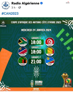 وارتباطا بمباراة المغرب وزامبيا، وقبل بداية المباراة بساعات، عرضت الإذاعة الرسميه لـ”عسكر الجزائر”، برنامج مباريات الجولة الأخيرة بدور المجموعات في بطولة أمم إفريقيا المقامة حاليا بكوت ديفوار، اليوم الأربعاء 24 يناير 2024 ، عبر مواقعها على الأنترنيت ، وألغت مباراة المنتخب الوطني المغربي وزامبيا ، لأسباب يعلمها “عسكر” دون سواهم.