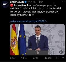 أكد رئيس الوزراء الإسباني بيدرو سانشيز أن استعادة إمدادات الكهرباء في مناطق الشمال والجنوب من البلاد قد تحققت بفضل تعاون السلطات في فرنسا والمغرب، معربا عن شكره لهما على “تضامنهما”.