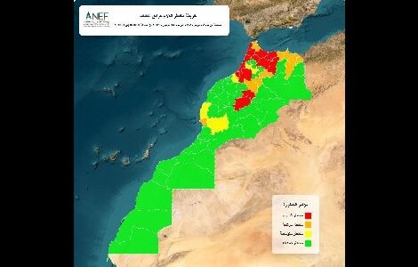 وأوضحت الوكالة، في بلاغ لها، أنه بعد تحليل البانات المتعلقة، خصوصا، بنوعية الغطاء الغابوي وقابليته للاشتعال والاحتراق، والتوقعات المناخية والظروف الطبوغرافية للمناطق، تم تحديد درجة خطورة قصوى (المستوى الأحمر) في أقاليم طنجة أصيلة، ووزان، والعرائش، وشفشاون، وتازة، وتاونات، والحسيمة، والقنيطرة، وبني ملال، وأزيلال، والصخيرات تمارة، وسلا، والرباط، والخميسات.