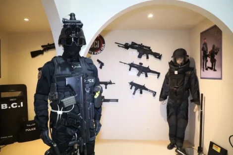 في زاوية من هذا الرواق، تكشف القوة الخاصة التابعة للمكتب المركزي للأبحاث القضائية، التابع للمديرية العامة لمراقبة التراب الوطني، عن مجموعة من الأسلحة الحديثة والمسدسات المتطورة التي تتميز بدقة الأداء، كبندقتي “Assault Rifle M4” و”Rifle Remington 700″، إلى جانب رشاشات “Submachine Gun HK MPS”، ومسدسات “Glock 19″، وغيرها من القطع الأخرى.